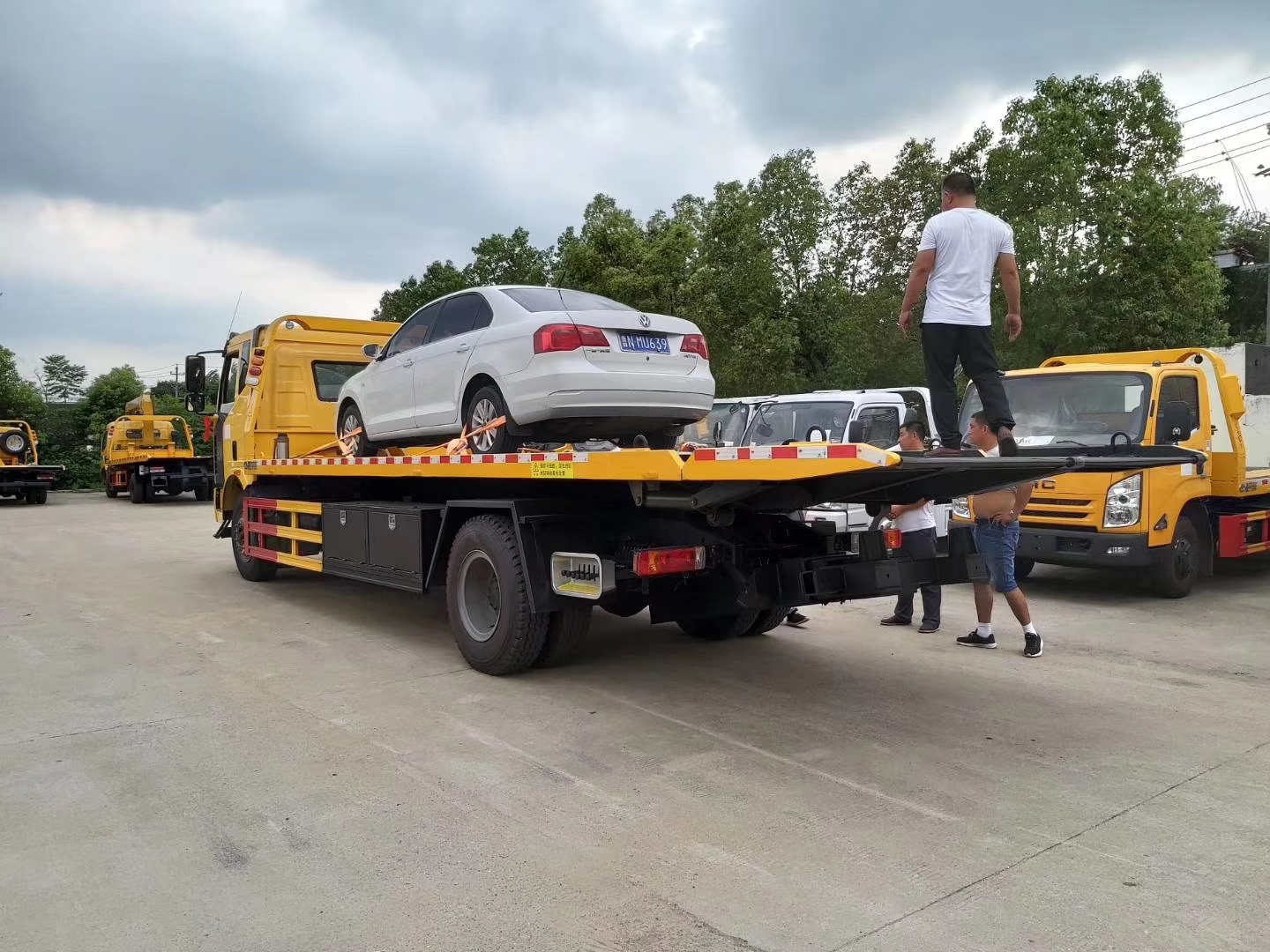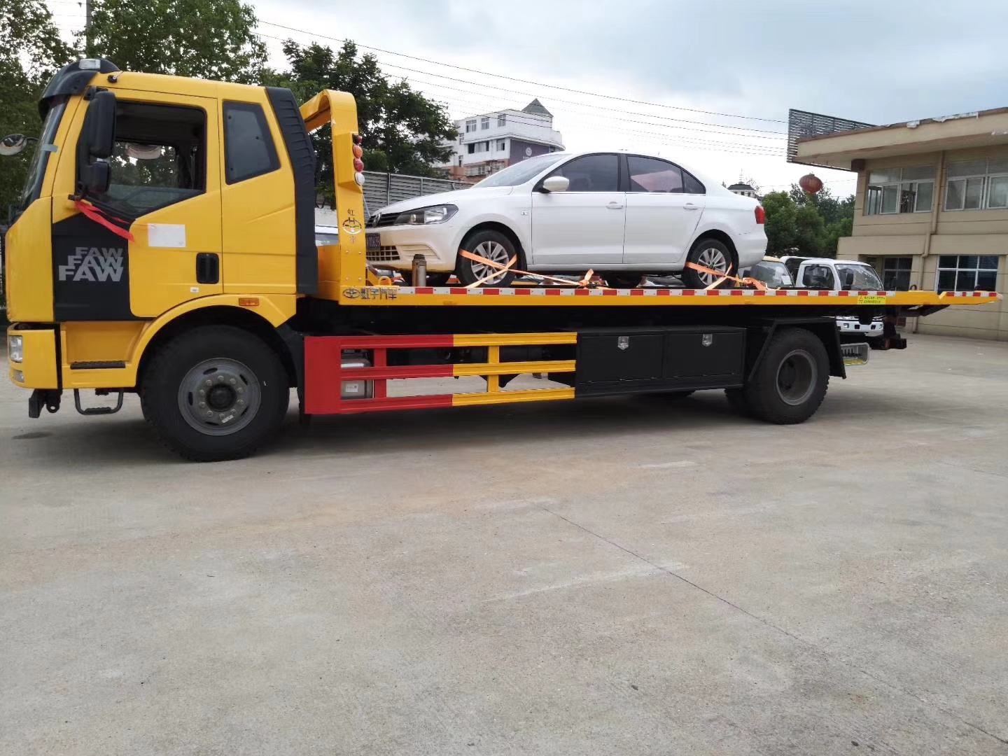 上裝配置:主板尺寸長7米,液壓翻轉尾板尺寸長1.2米,寬2.55米。10噸板,8噸絞盤,10噸后托臂。托叉座1套,前橋拖叉3套,鋼板拖叉1套,電氣系統1套,后工作燈2只,三角限位1對,工具箱2個,綁帶6根。其他標配。